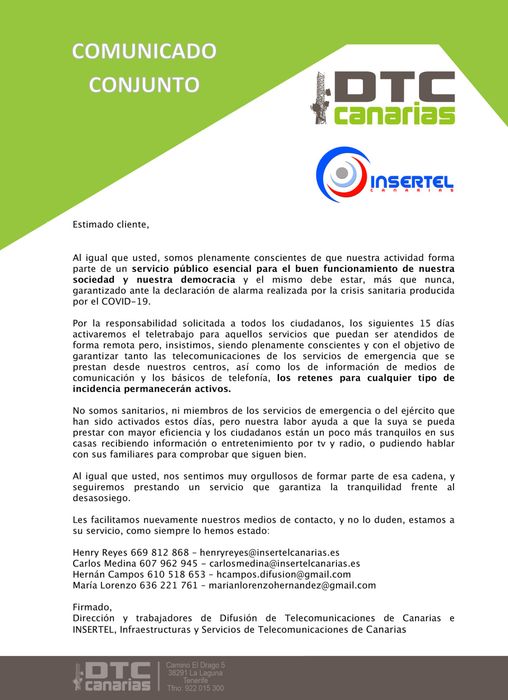 Мы являемся полностью канарским капиталом, который начал свою деятельность с целью предложить качественный сервис и, прежде всего, доступный для многих пользователей транспортных услуг и передачи сигналов или аренды телекоммуникационной инфраструктуры. С первоначальной идеей объединить некоторые из местных телевизоров и радиостанций, которые действовали на островах в то время, проект был преобразован в создание нейтрального оператора, который предоставляет услуги третьим сторонам. Если что-то показало, что создание этого проекта связано с необходимостью иметь ближайшего оператора, который понимает самую непосредственную реальность. Никто раньше не создавал и не предлагал такую услугу, собирал местных операторов под одной антенной и таким образом минимизировал визуальное воздействие; естественной заботой тех из нас, кто живет и живет на этой земле, для улучшения и ухода за тонким балансом между защитой территории и технологическим развитием. И все это, по лучшей цене, не теряя при этом немного качества.